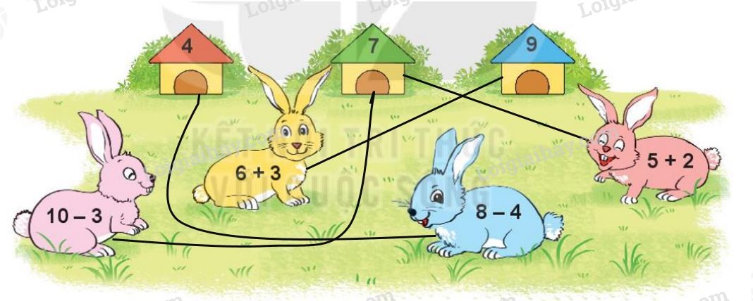 Mỗi chú thỏ sẽ vào chuồng có số là kết quả phép tính ghi trên chú thỏ đó. Hỏi chuồng nào sẽ có hai chú thỏ?