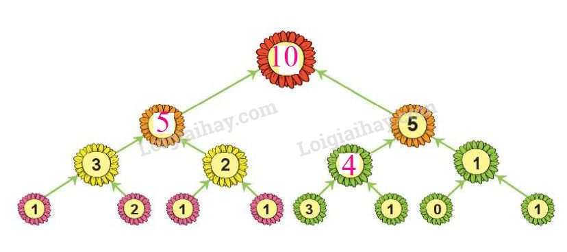 Số ở bông hoa trên bằng tổng của hai bông hoa phía dưới liền kề.