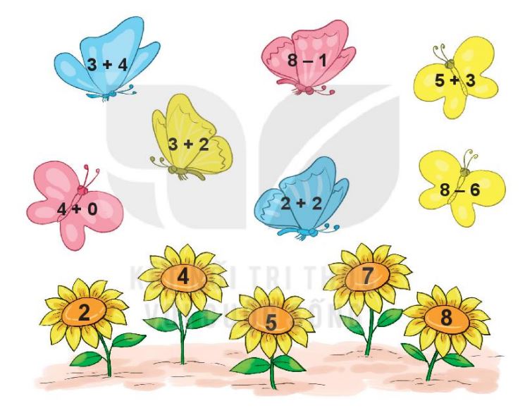 Bướm sẽ đậu vào bông hoa có số là kết quả phép tính trên cánh bướm.