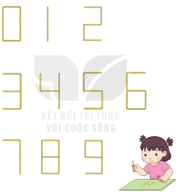 a) Em hãy xếp que tính thành các số 0, 1, 2, 3, 4, 5, 6, 7, 8, 9 theo hình dưới đây: