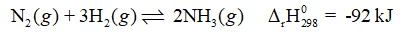 + Phản ứng thuận là phản ứng làm giảm số mol khí, theo nguyên lí chuyển dịch cân bằng Le Chatelier, để phản ứng chuyển dịch theo chiều thuận, ta cần tăng áp suất. Trên thực tế, người ta thực hiện phản ứng trên ở áp suất 25 bar – 200 bar.