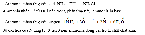 Cho biết ammonia thể hiện tính chất gì trong phản ứng với acid và oxygen.