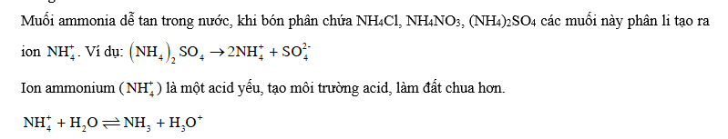 Muối ammonia dễ tan trong nước, khi bón phân chứa NH4Cl, NH4NO3, (NH4)2SO4các muối này phân li tạo ra ion