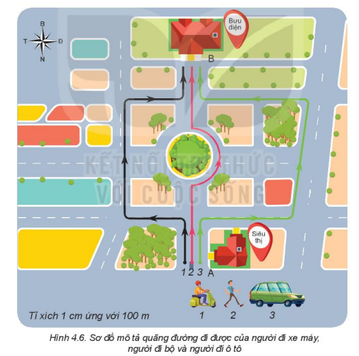 Bạn A đi xe đạp từ nhà qua trạm xăng, tới siêu thị mua đồ rồi quay về nhà cất đồ, sau đó đi xe đến trường (Hình 4.7).