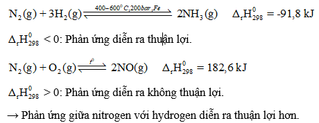 Dựa vào giá trị biến thiên enthalpy chuẩn của phản ứng, hay cho biết phản ứng giữa nitrogen với hydrogen hay với oxygen diễn ra thuận lợi hơn.