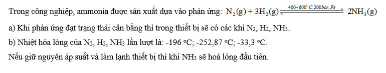 Trong công nghiệp, ammonia được sản xuất dựa vào phản ứng thuận nghịch giữa nitrogen và hydrogen trong thiết bị kín.