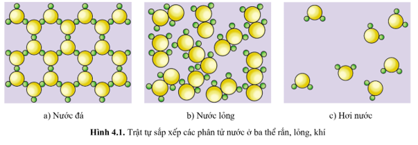 Hình 4.1 mô tả trật tự sắp xếp của các phân tử nước ở ba thể: rắn, lỏng và khí. Em hãy cho biết mức độ “mất trật tự” của hệ tăng hay giảm theo chiều từ nước đá tới hơi nước.