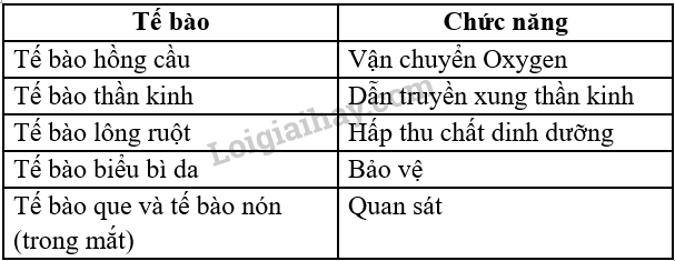 Nêu tên và chức năng một số loại tế bào trong cơ thể người.