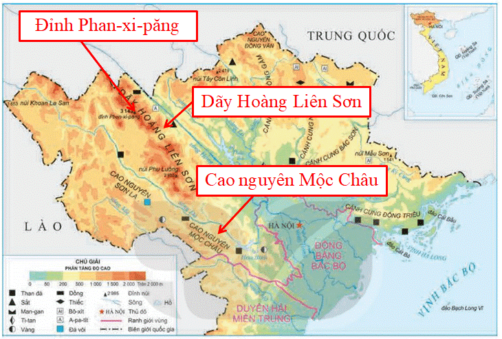 – Xác định trên lược đồ: dãy núi Hoàng Liên Sơn, đỉnh Phan-xi-păng và cao nguyên Mộc Châu.