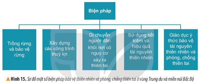 2. Đọc thông tin và sơ đồ hình 15, em hãy nêu một số biện pháp góp phần bảo vệ thiên nhiên và phòng, chống thiên tai.
