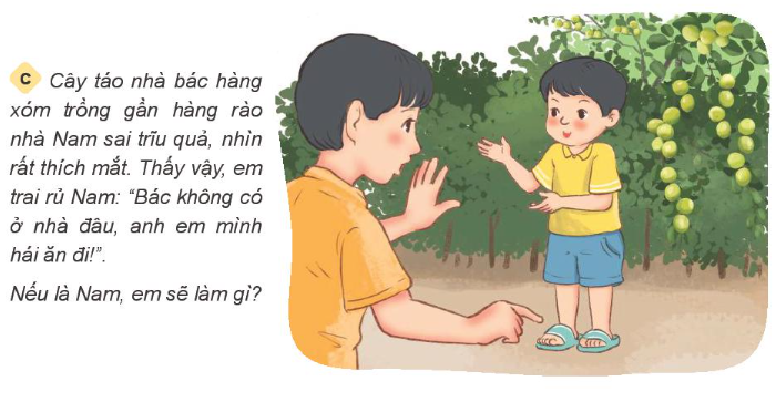 c. Nếu là Nam em sẽ giải thích cho em trai hiểu hành động đó là không đúng và không nên làm. Cần phải hỏi xin bác và khi có sự đồng ý thì mới được hái