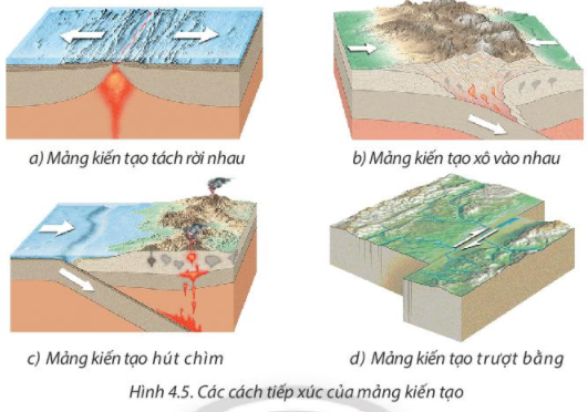 – Cho biết các mảng kiến tạo gần nhau sẽ có các tiếp xúc như thế nào. Cho ví dụ minh họa về kết quả của các tiếp xúc vừa nêu.