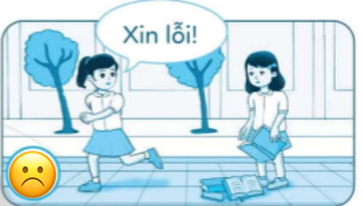 Bạn nữ chạy và va vào một bạn nữ khác, làm sách của bạn nữ đó rơi. Bạn nữ làm sai đã vừa chạy vừa ngoái đầu lại nói lời xin lỗi. Lời xin lỗi chưa thể hiện sự chân thành.