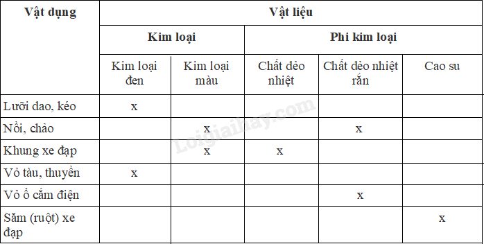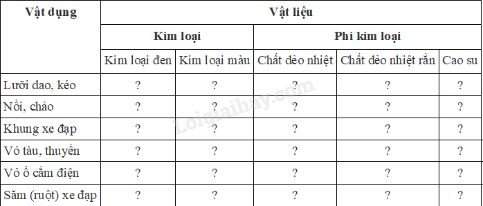 Các sản phẩm sau thường được chế tạo từ những vật liệu nào?