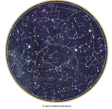 Tên các chòm sao trong Hình 4.3 là: Tam giác, Song tử, Người đánh xe, Đại Bàng, Mũi Tên, Thiên Nga, Con rắn, Đàn Lia, Vũ Tiên, Người Chăn Bò, Trinh Nữ, Tóc Tiên, Người Chăn Rắn, Sư Tử, Ngựa Một Sừng, Tiên Nữ, Ngựa Nhỏ, Thợ Săn, Con Cua, Con Rồng, Kim Ngưu, Con Cừu, Trường Xà, Mèo Rừng, Chó Săn, Tiên Vương, Anh Tiên, Thằn Lằn, Cá Heo, Song Ngư, Ngựa Có Cánh, Hươu Cao Cổ.