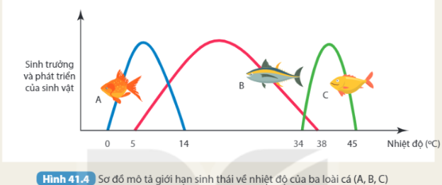 1. Ở địa phương, người ta có ý định nhập nội 3 loài cá (A, B, C) về nuôi. Nhiệt độ trung bình trong năm tại đây dao động từ 15oC đến 30oC. Dựa vào thông tin về giới hạn sinh thái nhân tố nhiệt độ của mỗi loài cá (Hình 41.4), hãy cho biết nên nhập loại cá nào để nuôi tại đây và giải thích.