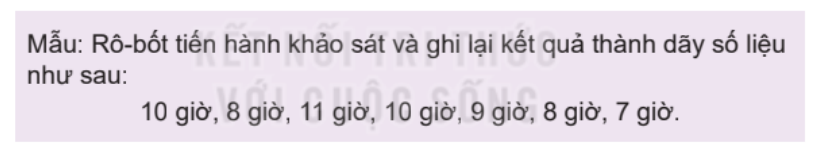 a) Hãy thực hiện một cuộc khảo sát về số giờ ngủ trong một ngày của các bạn trong nhóm em và ghi lại kết quả thành dãy số liệu (theo mẫu).