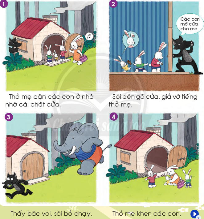 – Mẹ đi vắng, các con ở nhà phải đóng chặt cửa. Khi mẹ về, mẹ sẽ hát: “Thỏ con ngoan ngoãn, mau mở cửa ra…” thì các con mở cửa.