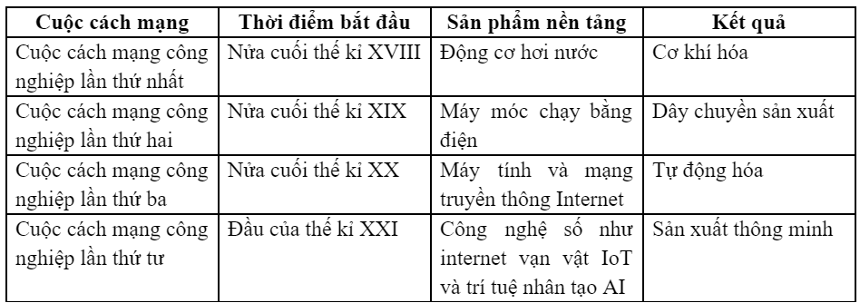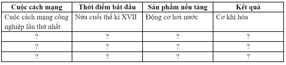 Hoàn thiện bảng dưới đây về các cuộc cách mạng công nghiệp.