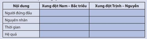 Hãy lập và hoàn thành bảng hệ thống (theo gợi ý dưới đây) về các cuộc xung đột Nam – Bắc triều và Trịnh – Nguyễn