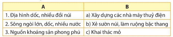 Em hãy chọn thông tin ở cột A cho phù hợp với thông tin ở cột B về mối quan hệ giữa điều kiện tự nhiên và hoạt động sản xuất ở vùng Trung du và miền núi Bắc Bộ.