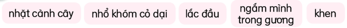 Những từ ngữ chỉ hoạt động của voi em đó là: nhặt cành cây, nhổ khóm cỏ dại, ngắm mình trong gương.