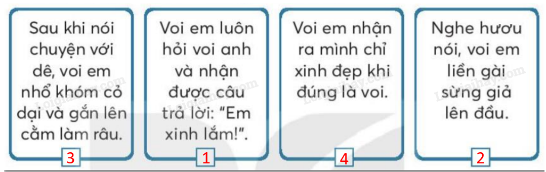 Sắp xếp các sự việc theo đúng trình tự trong bài đọc. Nối câu thoại phù hợp với nhân vật. ô màu những ô chứa từ ngữ chỉ bộ phận cơ thể. Những từ ngữ nào chỉ hành động của voi em? Cuối cùng, voi em nhận ra mình xinh nhất khi nào?