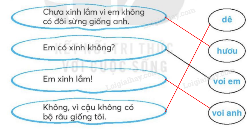 Em đọc lại lời của voi anh, hươu và dê nói với voi em để hoàn thành bài tập.