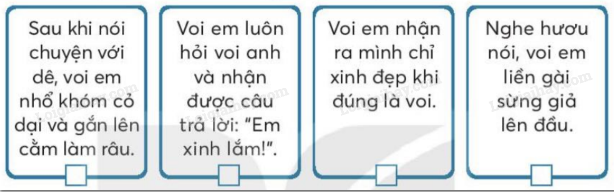Sắp xếp các sự việc theo đúng trình tự trong bài đọc. Nối câu thoại phù hợp với nhân vật. ô màu những ô chứa từ ngữ chỉ bộ phận cơ thể. Những từ ngữ nào chỉ hành động của voi em? Cuối cùng, voi em nhận ra mình xinh nhất khi nào?