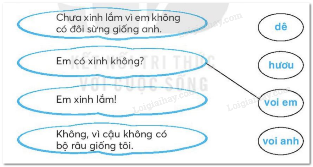 Em đọc lại lời của voi anh, hươu và dê nói với voi em để hoàn thành bài tập.