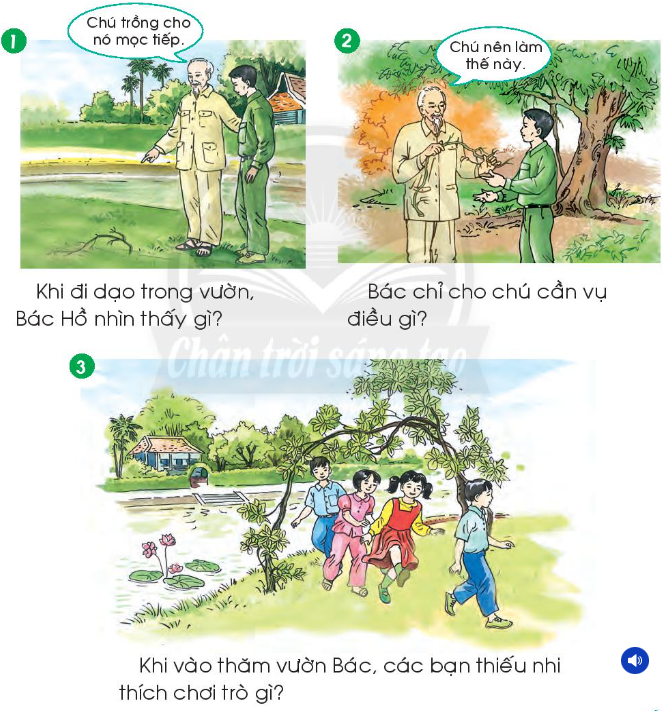 – Tranh 1: Bác Hồ đi dạo trong vườn. Đến gần cây đa, thấy khúc rễ phụ nằm trên mặt đất.