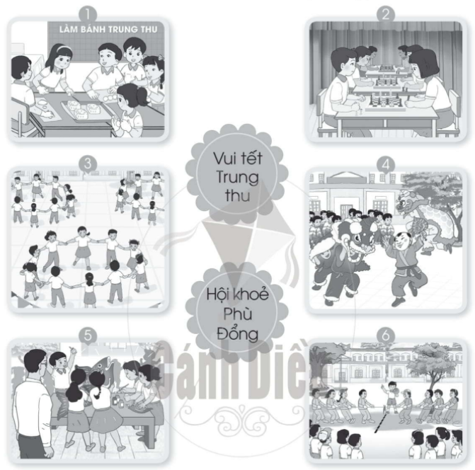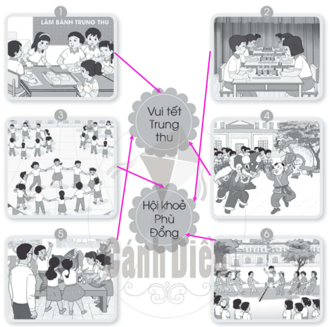 Nối tên sự kiện với ý nghĩa thích hợp. Khoanh vào những chữ cái trước hoạt động em đã tham gia trong Ngày hội Đọc sách. Trong số những hoạt động trên, em thích hoạt động nào. Nối các hình với ô chữ cho phù hợp. Sử dụng một trong các từ “hào hứng”, “tích cực”, “sôi nổi” để viết nhận xét về sự tham gia của các bạn trong các hoạt động Vui tết Trung thu hoặc Hội khỏe Phù Đổng. Vẽ một tấm thiếp chúc mừng Ngày Nhà giáo Việt Nam hoặc viết một đoạn ngắn về lòng biết ơn của em đối với các thầy, cô giáo.