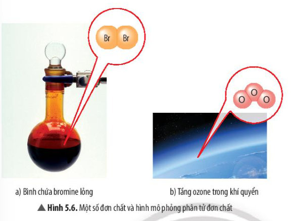 Quan sát Hình 5.6, em hãy cho biết số nguyên tử và thành phần nguyên tố có trong mỗi phân tử đơn chất