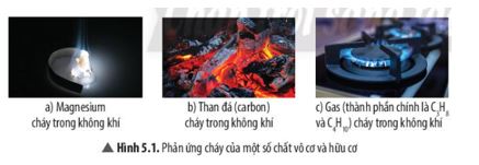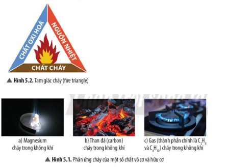 Dựa vào Hình 5.2, kể tên chất cháy, chất oxi hóa và nguồn nhiệt của các phản ứng cháy có trong Hình 5.1