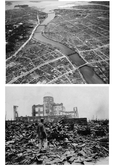 Vụ nổ bom nguyên tử ở Hiroshima, Nhật Bản vào năm 1945. Chỉ sau vài giây được thả xuống quả bom nguyên tử đã san phẳng 13km2 thành phố. Hơn 60% nhà cửa bị phá hủy hoàn toàn, con người chỉ còn lại tro cốt. Nhiều người trong số những người sống sót sau vụ nổ đã chết vì bị thương và bệnh nặng do bức xạ. Nhiệt độ do vụ ném bom tỏa ra tương đương với nhiệt độ của Mặt Trời.