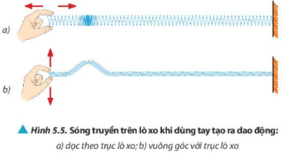Quan sát Hình 5.5, hãy so sánh phương truyền sóng và phương dao động của từng điểm trên lò xo trong hai trường hợp.