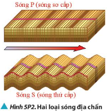 Hình 5.P.2 mô tả hai loại sóng địa chấn truyền trong môi trường khi xảy ra động đất: sóng P (sóng sơ cấp) và sóng S (sóng thứ cấp). Hãy phân biệt hai sóng địa chấn này thuộc sóng dọc hay sóng ngang. Giải thích.