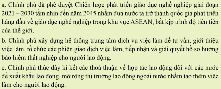 b. Nêu được trách nhiệm của học sinh trong việc thực hiện chủ trương, chính sách của Nhà nước về tạo việc làm, kiểm soát và kiềm chế thất nghiệp.