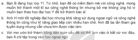 c. Trong trường hợp này, bạn A nên xác định được ước mơ và nghề nghiệp cụ thể, phù hợp với: sở thích, năng lực của bản thân và xu hướng tuyển dụng của thị trường lao động trong và ngoài nước (vì: công dân toàn cầu” là một khái niệm không rõ ràng, cụ thể). Bên cạnh kĩ năng ngoại ngữ, A cần tập trung rèn luyện thêm năng lực chuyên môn và các kĩ năng mềm khác, như: kĩ năng giao tiếp, thuyết trình, làm việc nhóm, giải quyết vấn đề,…