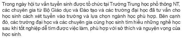 – Thông tin trên phản ánh về vấn đề hoạt động tổ chức ngày hội tư vấn tuyển sinh, giúp tư vấn cho học sinh cách xét tuyển vào trường và lựa chọn ngành học phù hợp để có công việc tốt trong tương lai. Bên cạnh đó, học sinh còn được hướng nghiệp khi tìm hiểu những nghề học sau khi tốt nghiệp dễ tìm được việc làm, phù hợp với sở thích và nguyện vọng của từng học sinh.