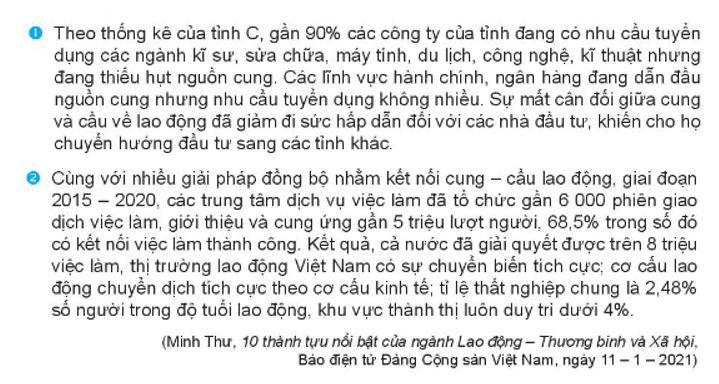 – Đọc thông tin 1 và chỉ ra được sự lệch pha về cung – cầu lao động tại tỉnh C. Và nêu lên được tác động của điều đó đến nền kinh tế.