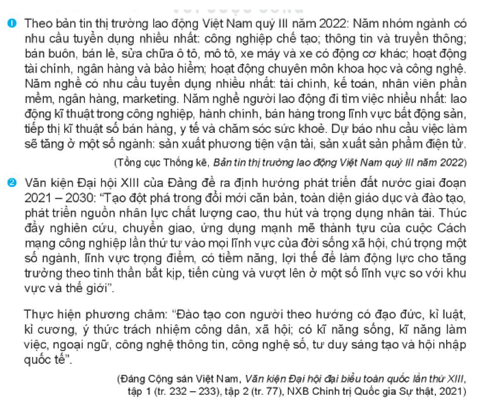2/ Những yêu cầu đối với việc phát triển nguồn nhân lực để thực hiện định hướng phát triển đất nước trong Văn kiện đại hội Đảng XIII cho thấy xu hướng tuyển dụng trên thị trường lao động sẽ là nguồn nhân lực chất lượng cao, có đạo đức, kỉ luật, kỉ cương, ý thức trách nhiệm công dân, xã hội; có kĩ năng sống, kĩ năng làm việc, ngoại ngữ, công nghệ thông tin, công nghệ số, tư duy sáng tạo và hội nhập quốc tế.