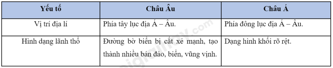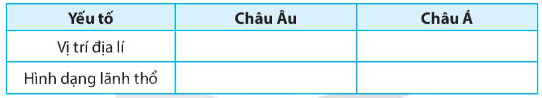 So sánh sự khác biệt về vị trí địa lí và hình dạng lãnh thổ giữa châu Âu và châu Á bằng cách hoàn thành bảng theo mẫu dưới đây.