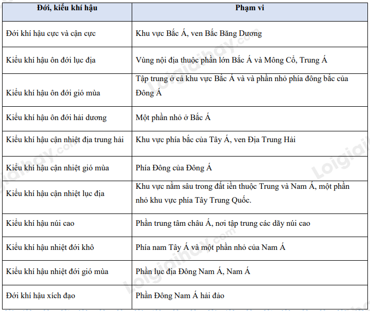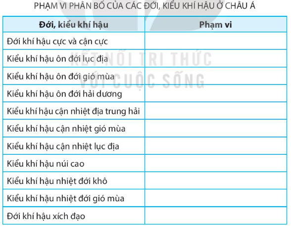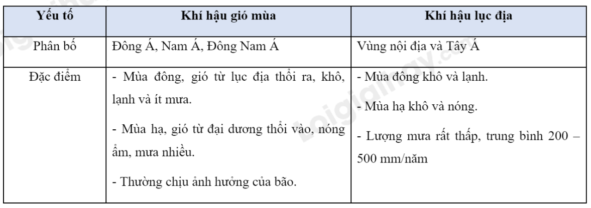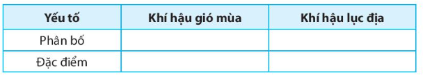 Hoàn thành bảng theo mẫu dưới đây để thấy được sự phân bố, đặc điểm khí hậu gió mà và khí hậu lục địa ở châu Á.