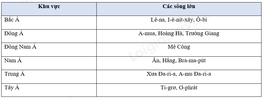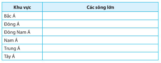 Cho biết tên các sông lớn ở khu vực châu Á bằng các hoàn thiện bảng theo mẫu dưới đây.