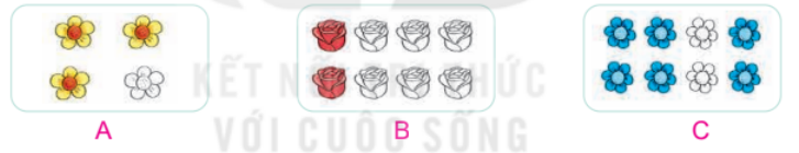 Hình C: Các bông hoa được xếp thành 4 nhóm như nhau, có 3 nhóm được tô màu. Vậy đã tô màu $\frac{3}{4}$ số bông hoa của hình C.