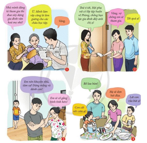 – Ảnh 3: Bố mẹ thực hiện việc khuyên nhủ, tâm sự; không đánh, mắng con cái.
