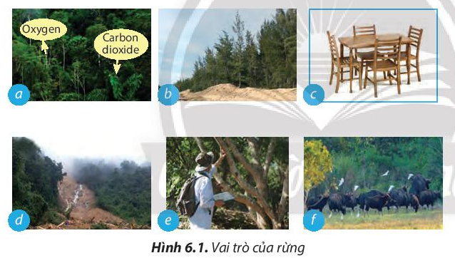 Quan sát vào hình 6.1 ta thấy các vai trò của rừng như hình a – hít cacbonic và thải Oxy; hình b – chống cát, chắn gió; hình c – làm bàn ghế; hình d – chống xói mòn, sạt lở đất; hình e – phục vụ nghiên cứu; hình f – môi trường sống của nhiều loài vật.