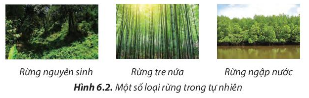 Quan sát vào hình 6.2 ta thấy có 3 loại rừng là rừng nguyên sinh, rừng tre nứa và rừng ngập mặn.