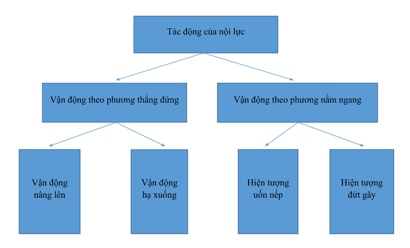 Tác động của nội lực thể hiện qua vận động theo phương thẳng đứng và phương nằm ngang. Phương thẳng đứng là vận động nâng lên, hạ xuống. Phương nằm ngang là hiện tượng uốn nếp và đứt gãy.